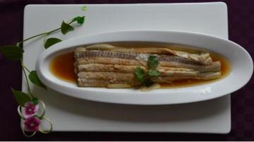 (2)将鱼去鳞、去鳃,用竹筷子从鳃部伸入鱼肚内,搅住鱼肠等内脏,用力从鱼鳃部拉出来,用手挤压鱼身,把剩余的血水挤净后,用清水冲洗干净,煮开水,把鱼放入锅中烫一下,取出,以去腥味。把鱼平放在长形的鱼盘中,上面撒上火腿片、春笋片、香菇丝、姜丝、葱段,再加入肉汤、料酒、盐、虾子等,上屉,用旺火蒸约30分钟,蒸熟后,再淋上味精、胡椒粉即成。