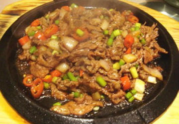 7、淋入调和油,再倒入炒好的牛肉条,随声吱吱立马上桌。