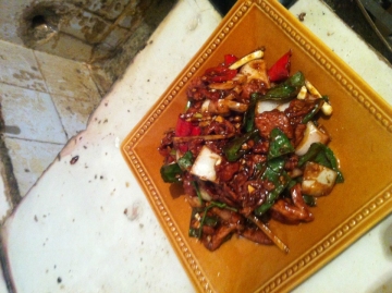 4, 重新起锅,放少量够炒蔬菜的油,先下姜片进去炸,等油热了姜味也很浓了.然后蒜片,洋葱和红椒片炒到刚断生.