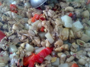 3、锅中放油,烧热,下鸡块、姜片,炒至鸡肉变色,鸡皮收缩出油时,加入红椒、蒜片和一勺郫县豆瓣,适量老抽、盐炒到鸡肉块均匀上色,汤汁变红;