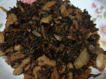 5、锅内烧热少许油,下梅干菜炒匀,加入生抽和少许水;