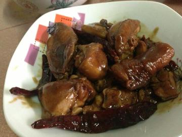 把姜片爆香,放入幾條辣椒乾炒一炒~再放下腌制了的鸡炒。炒香了,加点水去焖。试下味道,不够咸就加一点酱油,就可以上碟了!