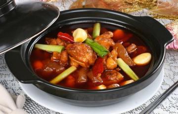 3.锅内放油烧热,下入姜片、八角、桂皮,花椒,干辣椒炒出香味,放入鸭块、 酱油、绍酒炒上色,然后倒进沙锅 加清水,要没过鸭子,大火烧开,改小火烧至熟烂。