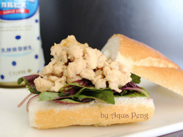 4.起鍋後放置一旁,將麵包稍微熱一下,放上生菜,雞肉後在淋上些許醬汁即可。
