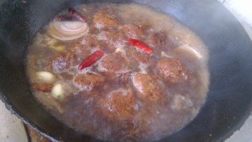3、锅内留底油,放葱姜蒜红辣椒大料炒香点入少许老抽,加水,开锅后放入丸子,小火炖10分钟,出锅即成。