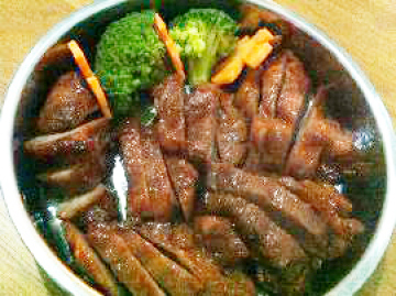 04.平底锅内放油烧热,用中火将肉块两边煎至刚熟即可。(约每边一至两分钟,要勤翻面,因为有麦芽糖的成份很容易烧焦)最后出锅后,再放少量蜜糖(蜂蜜翻拌均匀即可)