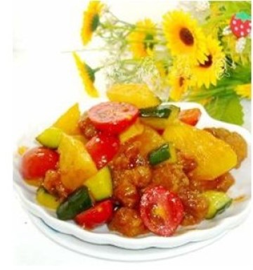 菠萝排骨、蒜苗烧黄豆茅、蛤蜊烧鸡。