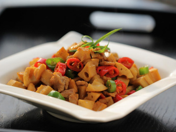 2.油锅热后,略煸蒜末、干辣椒,下尖椒、藕丁翻炒,加盐,少许米醋、胡椒粉、鸡精,炒匀片刻即起锅(中间若太干,应稍点水,保证藕丁色泽洁白)。