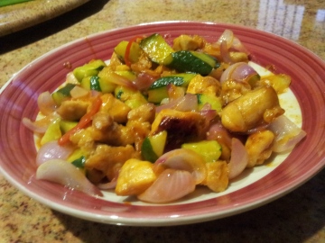 5、倒入少许的油,放入蒜米丁爆香。之后放入洋葱、鸡丁和调好的酱汁翻炒。