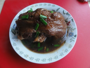 烧一锅滚水,下葱姜料酒,放入猪腿,煮出血沫沫,至表面变色,水倒掉,捞出猪腿用冷水冲洗干净。另干净大锅一口,大半锅冷水盖没猪腿,葱,姜,酱油,老酒,糖(or蜂蜜),醋,大火煮滚,然后加盖小火焖,等到一锅水变成一勺稠嗒嗒的酱汁,就可以出锅装盘,开吃了。