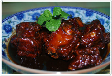 5、上桌时,在在排骨上加上几瓣薄荷叶,点缀一下,让绛红的排骨充满薄荷香。