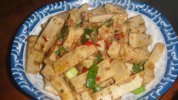 (3)将调味料搅拌均匀,淋在芋头条上,或者以芋头条沾食亦可。