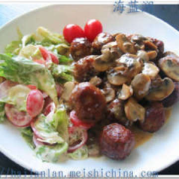 1. 主要准备的材料:(一共做了29个两份儿的量) 1)肉丸:牛肉馅130克,猪肉馅130克,橄榄油适量,清水80ml,面包糠100克,鸡蛋1个,酱油3大勺,盐1/2勺,黑胡椒碎1大勺+1小勺。 2. 酱汁:黄油50克,双鲍菇7个,淡奶油60ml ,酱油1小勺。 3. 双鲍菇7个。 4. 配菜:生菜,小西红柿等随意,千岛酱适量。 5. 将牛肉馅和猪肉馅及鸡蛋混合。 6. 加盐,搅拌均匀 7. 将面包糠中放入黑胡椒碎,80ml清水和3大勺酱油。 8. 搅拌均匀后放置10分钟,让面包糠充分的吸收水分。 9. 将搅拌均匀后的肉馅倒入面包糠,再搅拌均匀。 10. 双鲍菇切片。 11. 用手将肉馅揉成小丸子。 12. 锅中倒少许油5成热时,放丸子,调成中小火将丸子煎熟后盛出。 13. 煎熟盛出的丸子。 14. 小火将黄油融化。 15. 小火将黄油融化,放入蘑菇。 16. 炒软后,加酱油1小勺和淡奶油,继续用小火熬成浓稠的酱汁,淋在肉丸子上即可。 17. 盛盘上桌。