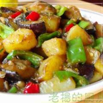 1. 土豆一个,切块。 2. 茄子切块(比土豆块大一点),辣椒切块(和茄子差不多大)。 3. 蚝油一汤匙,香醋一汤匙,酱油一汤匙(生抽老抽一比一为好)一茶匙盐白糖半茶匙,味精半茶匙,五香粉一茶匙,香葱两根切碎。 4. 蒜碎,红辣椒碎,姜片,虾米一撮(食指中指拇指捏一下的一撮)。 5. 倒足够的油,中火,油五成热,下土豆,不断用漏勺的背面(圆凸的那边向上)铲,防止粘锅。 6. 等土豆外壳发硬,下茄子。茄子软了,以后,捞出土豆和茄子。 7. 大火烧油,下土豆茄子和辣椒,勺子背面铲几下即可。 8. 炸好的三种材料。 9. 把油倒出来,不要再放油。小火,炒辣椒段,蒜碎,虾米,有虾米的香味下三种材料,翻炒几下,倒入汁,转大火,迅速翻炒。翻炒可以用勺子背,一下提起,不要来回炒,来回炒就容易碎烂。 10. 出锅放香油即可。