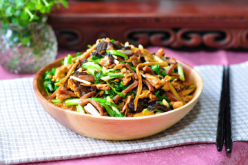 4.炒锅内加油烧热,将肉片放入煸炒,肉色变白后,加入葱丝、姜丝同炒,至八成熟时,加入料酒、酱油、盐,炒匀后加入木耳、黄花菜、黄瓜和鸡蛋块同炒,完全炒熟后淋入香油即可。