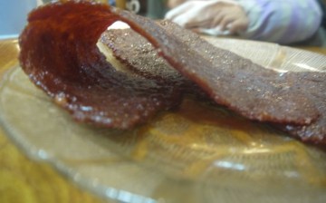 5. 打开上层的胶袋纸, 把肉片和下层的垫纸一起取出,摊在烈日下曝晒6~8小时。晒了3~4小时后必须翻片。办法是先将一张烘培纸或塑料纸盖上肉片,然后把下层的纸及肉片一起翻转过来, 再去掉在上层的塑胶纸或烘培纸,继续晒3~4小时至干至不黏手。
