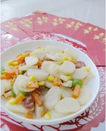 玉米,香肠,莲藕,西芹,胡萝卜,年糕,油,糖,生抽少许