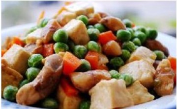4、放豌豆、豆腐翻炒几下,少放一点盐就好了。