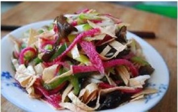豆腐皮,青椒,红萝卜,黑木耳,葱白,蒜片,糖,鸡精,陈醋
