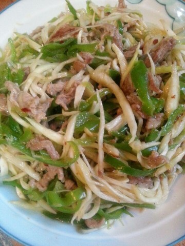 3)炒锅油热,入肉丝划散盛出,剩油入青椒丝,加少许盐和糖(各1/8 table spoon),快速翻炒几下出锅待用;
