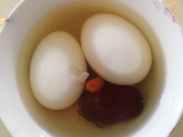 绿壳土鸡蛋2个,小红枣3个,枸杞少许,黄芪5小片,红糖适量