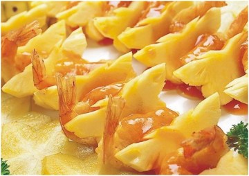 2、取100g菠萝切成小片,同鲜虾一起码盘,上下火150度烤150分钟。