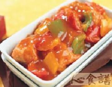 a.油条1根,山药150公克,凤梨罐头2大片,红椒1/4个,黄椒1/4个,青椒1/4个,高汤1杯,b.中筋面粉3/4杯,泡打粉3公克,冰水1/2杯,植物油1小匙,蕃茄酱2大匙,薏仁醋1大匙,玉米粉1小匙,糖1大匙,盐1/2小匙,水2大匙