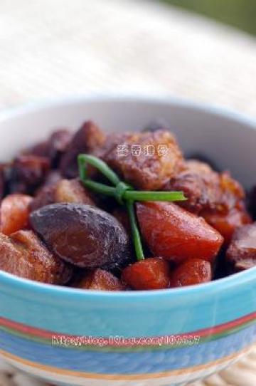 5.加入胡萝卜块和香菇块,加一点老抽上色,再放半汤匙糖。如果喜欢吃有汁水的,那么这时候稍微加小半碗水一起煮。我这里没有加水