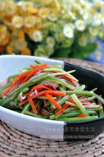 2.锅烧热放油,油温烧热放胡萝卜丝,煸炒至身软