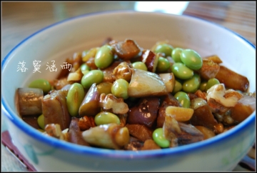5、将茄子和毛豆装在一起,撒上核桃碎,撒上鲜酱油、糖和少许的醋,最后淋上橄榄油,搅拌均匀即可上桌。