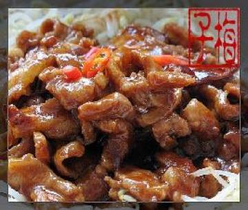 3、 酱汁的炒制:甜面酱要炒至红亮粘稠,使肉丝能均匀的挂上甜面酱,而锅中没有多余的酱汤方为成功。