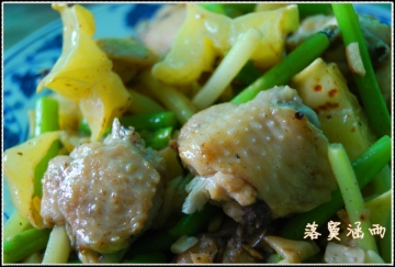 7、余油下蒜瓣和姜片炒香,将鸡翅、芦笋和杨桃一起下锅翻炒。