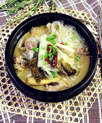 5、粉丝用温水泡软,酸菜炖一个小时后,加适量盐、鸡精,放入粉丝炖五分钟即可出锅。