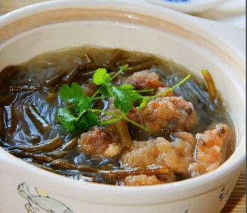 (5)炒勺上火,加入鹿角菜、精盐烧开,撇去浮沫,再将香菜段、葱丝姜丝撒在酥肉上,炒勺内汤汁加入味精、醋、香油、胡椒粉,浇在酥肉上即成。
