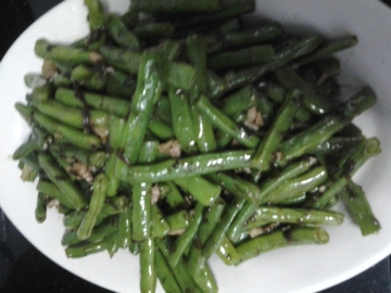 将四季豆飞水约四分钟(一定要熟透),肉碎腌好,先下油少许将肉碎下锅炒熟加入蒜茸、榄菜、四季豆一起最后下鸡粉少许、盐