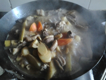 2.入油锅翻炒喷酒,生抽,加水大火煮沸,再加老抽,盐,糖,据大厨透露,还加了点独门秘笈-耗油。