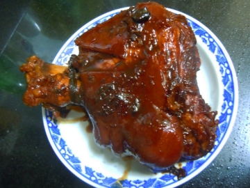 3、收汁时要耐心,不能离人,特别是快浓缩粘稠时,要小火,把蹄髈用根筷子架空些,不然很容易粘锅。