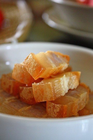 7、肉蒸好以后,稍稍凉下就切成薄片,直接吃了,味道非常香美,肉的颜色很好看,肉皮是暗红色,肥肉是透明的,瘦肉是深红色,特别是香气,在蒸的时候都会忍不住唵口水的。