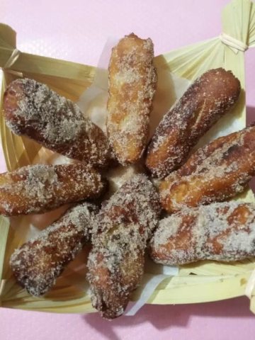 8、捞出后沥干油分,快速的在肉桂糖蘸粉中滚一下即可。一口下去外酥里嫩,还有点流浆。如果配上一杯热巧克力饮料那就更赞了!
