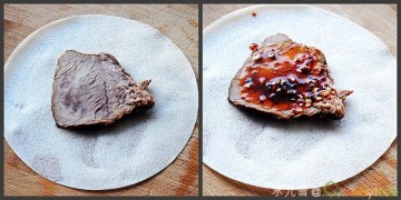 9、牛肉切块。随意吃。我发明的方法有卷着煎饼吃,放点辣椒油酱油拌的汁,相当得好吃,如图。也可以撕出丝来拌着吃。看起来还可以。没有牛腱字肉那样的好看