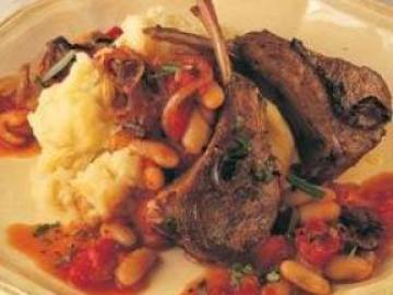 粉质马铃薯700克,盐、黑胡椒适量,橄榄油2汤匙,中等大小洋葱2颗,大蒜2瓣,羊排8块,每块约100克,新鲜迷迭香4枝,李形番茄或中等大小番茄225克,羊肉清汤、清鸡汤或高汤200毫升,罐装白菜豆400克,香芹,盐少许,牛奶3—4汤匙