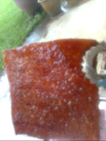 5. 打开上层的胶袋纸, 把肉片和下层的垫纸一起取出,摊在烈日下曝晒6~8小时。晒了3~4小时后必须翻片。办法是先将一张烘培纸或塑料纸盖上肉片,然后把下层的纸及肉片一起翻转过来, 再去掉在上层的塑胶纸或烘培纸,继续晒3~4小时至干至不黏手。