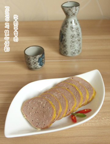 9.蒸好的牛肉取出,就是午餐肉了,放在一边晾至冷却再切片(慧心贴心提示十六:蒸熟的午餐肉冷却后再切片,因为刚蒸熟的午餐肉肉质之间有热气流通,切制时肉容易松散,且容易粘刀,冷却后的午餐肉肉质之间紧密,切制时肉质不会松散)。食用的时候切片即可。