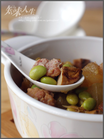 p1:毛豆一定要时令,逐一剥得,鲜嫩无比。冬瓜去皮切大块。