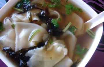 12张馄饨皮(50克),50克夹心裹成一客小馄饨。右手用尖筷将馅心剔进左手皮子中,左手中指屈起下落。包进馅心后,由食指,无名指,拇指同时屈起捏拢皮子四角,呈四角菱形状即可。注意捏拢皮子时尽量使四角悬空而捏。切忌将馅心平摊在左手掌中捏拢,行话称此为捏死皮馄饨。馄饨下锅后,水滚馄饨浮上,反复两次四角菱形一面向上,此时馄饨必熟无疑。