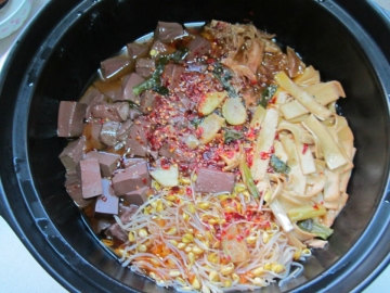 6.先加入土豆片煮约2分钟,再加入金针菜和木耳煮约2分钟,接着加入鳝鱼段及牛百页,火腿,黄豆芽,金针菇。最后才加入猪血煮至汤再度沸腾