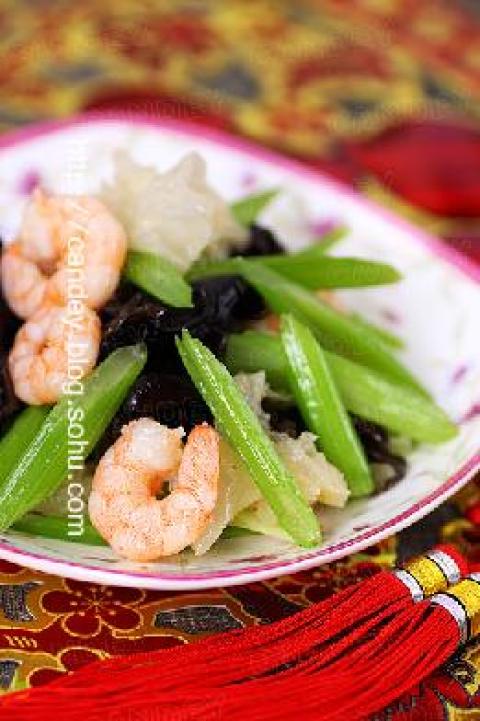 芹菜10根,木耳一大朵,银耳一大朵,虾12只,辅料:盐1/8匙+1/2茶匙,姜丝蒜片适量,花椒20粒,糖1/4茶匙,味精少许
