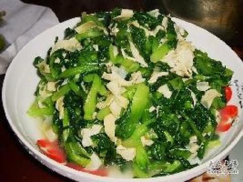 百叶本身就是熟的,鸡毛菜也是很好熟的,所以,这道菜在炒制的时候动作一定要快,否则炒的时间久了,菜里的维生素流失了,豆腐皮也烂了,那味道就大打折扣了。