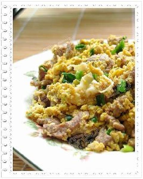牛肉切薄片,放入腌料(酱油、姜汁、酒、白糖、淀粉、花生油)拌匀,泡嫩后捞起待用,打散鸡蛋后,放入盐拌匀;2.将腌制好的牛肉放入蛋液中;3.将锅烧至十分热,放入油,油热后,放入蛋液,用中火拌炒至蛋凝固,撒入葱粒拌匀,即可上桌。