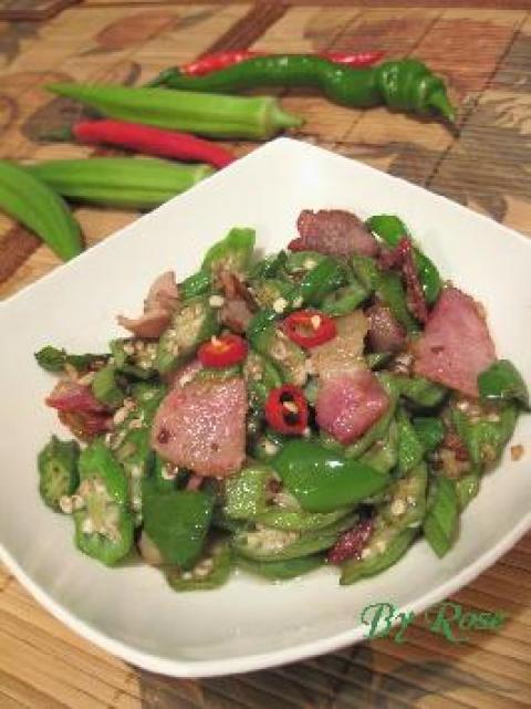 秋葵,辣椒,咸肉片,蒜